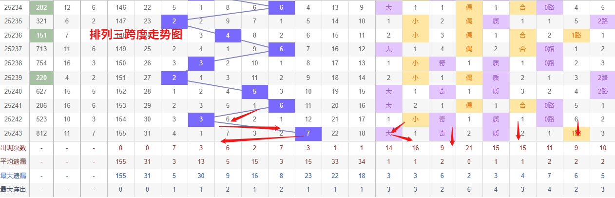 排列三 跨度分析:从上图可以看出近100期的跨度大小比约为52比48,跨度奇偶比约为53比47总体来看还是比较均衡的,但跨度大小之间有点差异。我们再从历史开出7跨后下一期4跨度数据来做参考。最近10期跨度大小比约为5:5期开出小数跨度过多返回大数跨度的概率更高一点。历史开奖近2期出7跨以后的走势为155期开出7跨后下一期走8跨走出1振幅,第169期开出7跨后下一期走9跨走出2振幅第174期开出7跨后下一期开出4跨走出3个振幅。连续多期小振幅。近期排列三跨度走势呈现明显分化格局:跨度8和9作为冷号已持续多期未见,遗漏值分别攀升至较高区间,冷态压力显著积累,从历史回补规律来看,大跨度冷号虽出现频率较低,但长期遗漏后往往存在较强的理论反弹动能,尤其当遗漏周期接近历史极值时,需警惕其突然解冻并回补的可能;反观跨度4和6近期热出频繁,其中跨度4连续多期活跃,跨度6也呈现高频态势,热号特征明显,且中小跨度本身在概率分布中占优,历史数据中热跨度连开3期以上的案例常见,短期内延续热态的概率较高。综合采取"追热防冷"策略,优先关注热跨度4和6的连下潜力,尤其是跨度4的持续性需重点防范,同时将冷跨度8和9纳入观察名单,遗漏值进一步扩大可适度布局回补,综合以上分析后得出,本期预计跨度遵从历史会走出小振幅,出7跨度后容易走出1到4个跨度振幅的对称形态,跨度走出1到4个振幅看好的跨度有4689跨,所以第2025244期排列三跨度推荐4689跨。本文由一起彩钱是生命动力所著,请勿转载