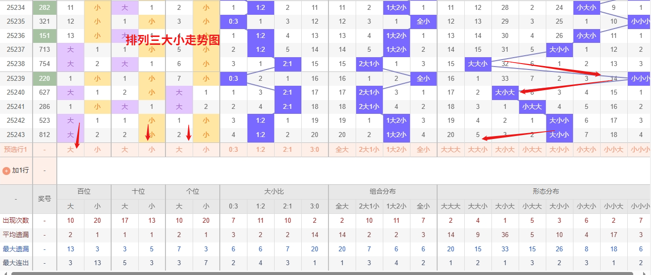 排列三 大小形态分析:从大小走势图上可以看出排列三100期内百位大小比约为45比55,十位大小比约为46:54,个位大小比约为51比49,除了百位和十位奇数比偶数多,个位是偶数比奇数多。历史数据近2期开出小大大下一期的走势为,第165期开出大小小第166期开大大大。第174期开出大小小后第175期开小大大,第182期开出大小小后183期开小小大近期排列三大小走势呈现明显分化:组合"大大大"和"小小大"持续低温,遗漏期数均已攀升至历史较高区间,冷态压力显著积累。从历史回补规律看,此类冷门组合长期遗漏后往往存在较强的反弹动能,尤其当遗漏值接近周期极值时,需警惕其突然解冻的可能。反观组合"小大大"近期热出频繁,呈现连续开出的强势特征,热号延续性明显。所以排列三第2025244期大小形态推荐小大大大大大本文由一起彩钱是生命动力所著,请勿转载