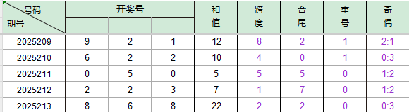 2025212期开奖号码223,我们可以看出近30期百位2出现7次,十位2出现5次(较213期减一),个位3出现5次。