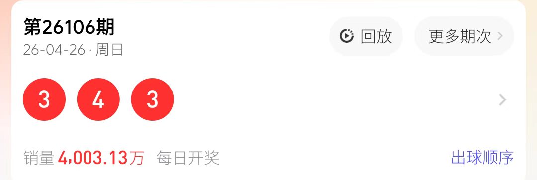 排列326107 开奖结果为 3 4 3