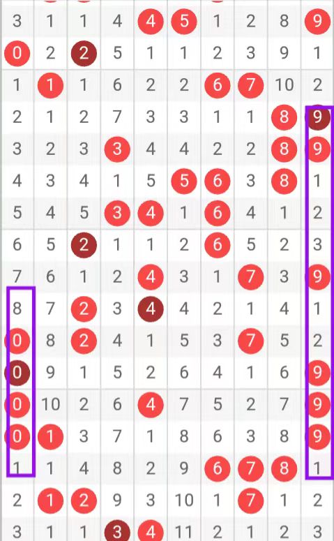 4根据上期百位开出3依托2 号和9 如图所示我紫色方框框出,都紧贴热码9号,根据走势推测,百位持续走势可能性会较大