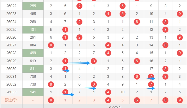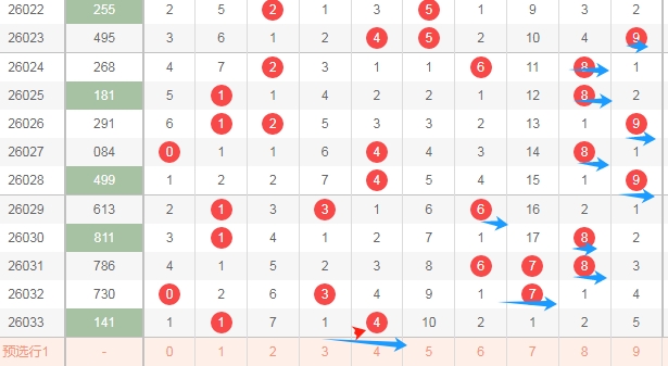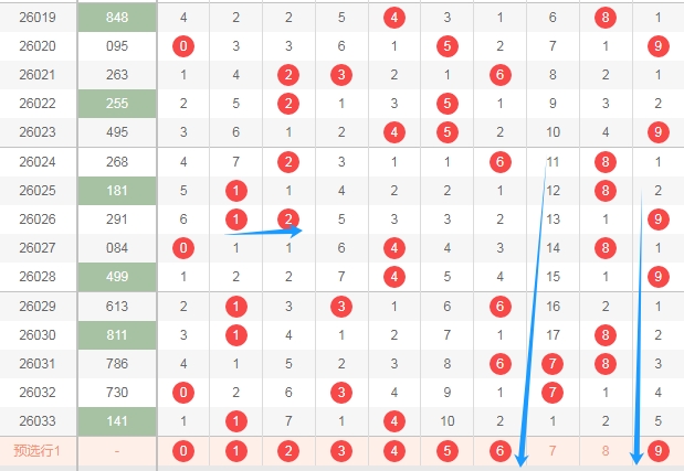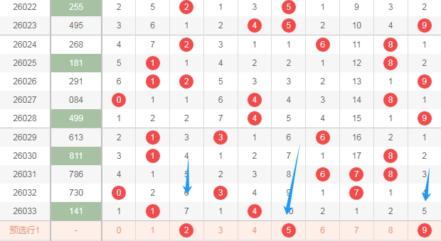 从上图中的体彩排列三开奖号码走势图中标注出来的蓝色小箭头发现,最近开出的质数比开出的合数多,那么本期个人观点就是合数数字04689至少要出1个吧,我在上面走势图中标注出来的数字都是合数数字04689。