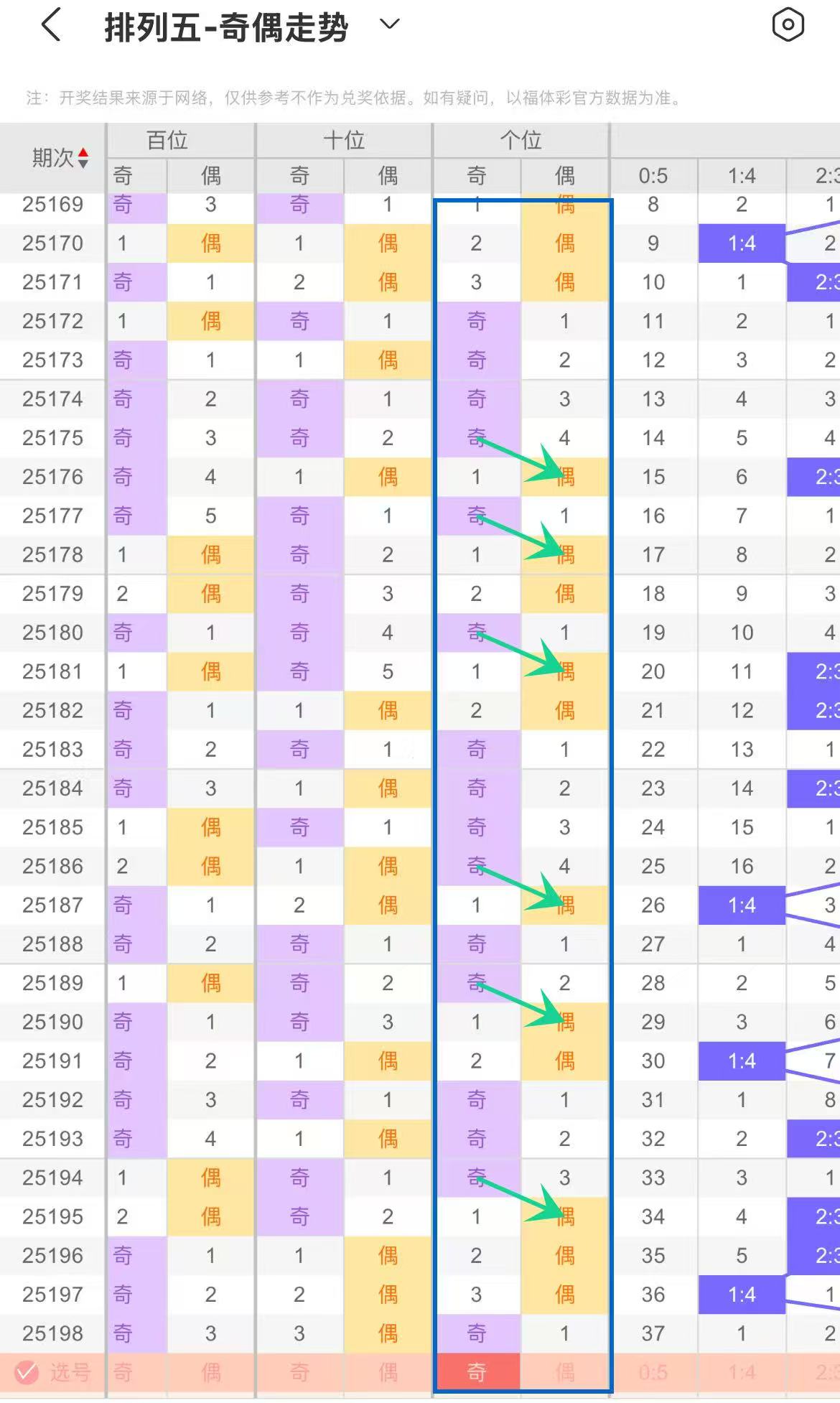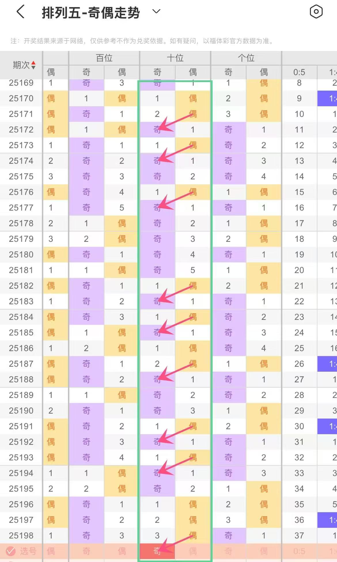 根据上图排列五十位奇偶走势分析,连下与回补交替呈现。连下阶段奇数或偶数持续,形成短期趋势;回补动作适时打破连势,重塑奇偶分布。回补时,需关注连下惯性对后续的影响及新趋势。节奏把控关键,回补快慢、连下重启时机左右走势,要留意奇偶力量消长,从回补幅度与连下强度,本期参考回补奇数(13579)