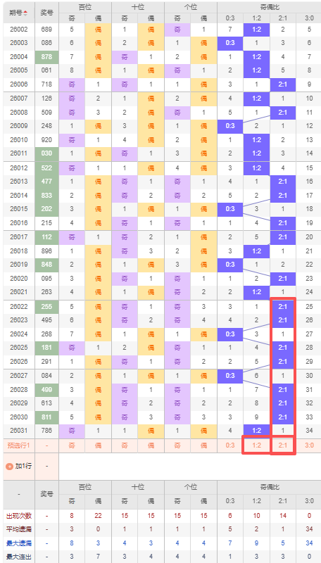 上期奇偶比:1:2,近10期奇偶比出现情况:2:1、2:1、0:3、2:1、2:1、0:3、2:1、2:1、2:1、1:2,最近10期出现7期2:1,出现1期1:2,出现2期0:3,出现0期3:0,根据近10期出号规律本期推荐连出1:2,防隔期出2:1,综上所述奇偶比推荐:防:2:1,重点关注:1:2。
