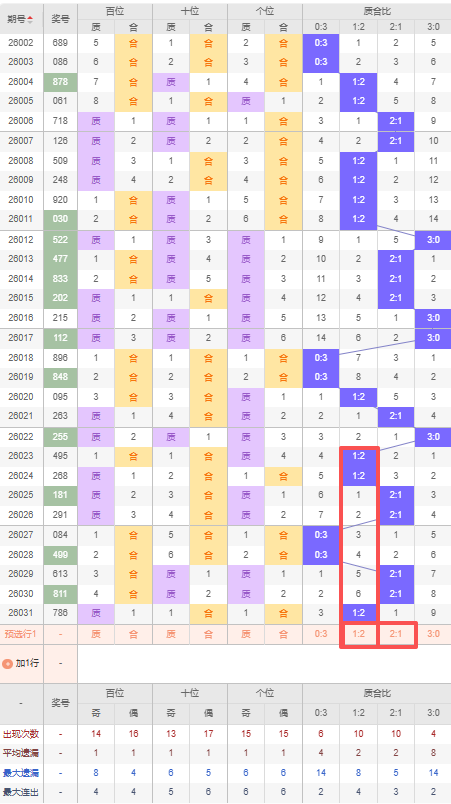 上期质合比:1:2,近10期质合比出现情况:3:0、1:2、1:2、2:1、2:1、0:3、0:3、2:1、2:1、1:2,最近10期出现4期2:1,出现3期1:2,出现2期0:3,出现1期3:0,根据近10期规律本期推荐连出1:2,防隔期出2:1,综上所述质合比推荐:防:2:1,重点关注:1:2。