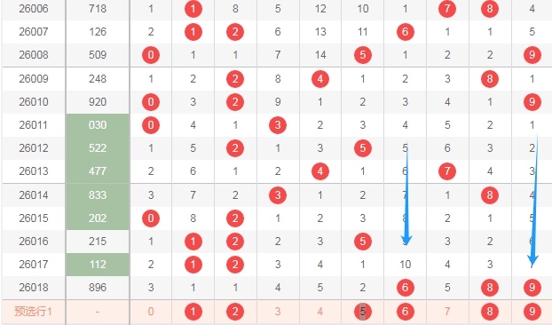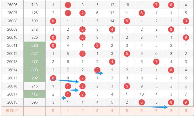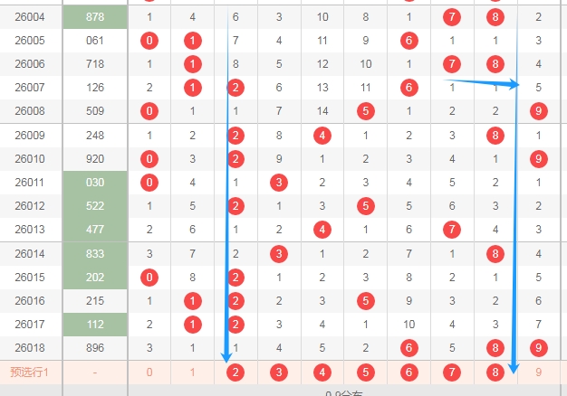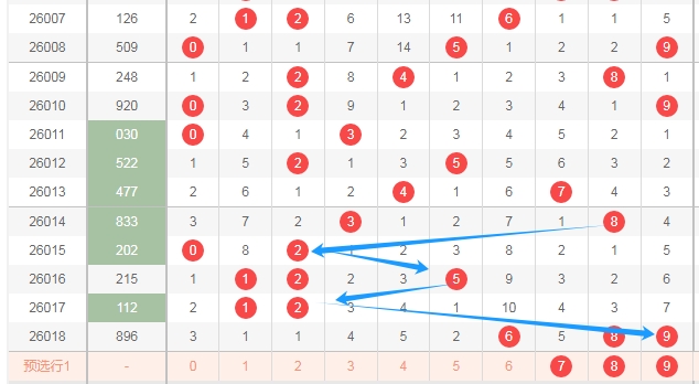 看上图走势图中标注出来的蓝色大箭头这个表示的就是最右边这个数字之间的跨度,上期的跨度是从数字2到数字9跨度是7,最近几期这个跨度大的多,那么本期个人观点关注这两个数字之间的跨度走小,那么假设走小的话,那么本期这几个数字789至少得出1个,因为跨度走小的,那么就是上期号码9附近的数字。