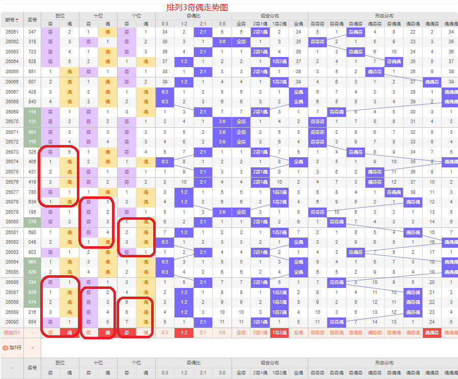 上一期的奇偶比为2:1,两奇的号码组合,从近五期的奇偶数出现情况看,奇数出7次,偶数出现8次,奇数偶数号码出现较平均,本期要侧重两偶的号码组合,侧重偶偶奇或偶奇奇的号码组合,根据奇偶组合形态可做五码定位02468/02468/13579或02468/13579/13579