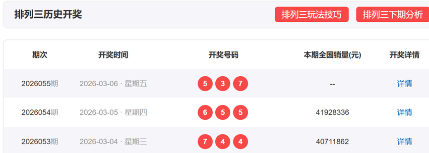 体彩排列3上一期,开奖号码为537,形态为组六,奇偶比为3:0,012路数值表现为201,和值15,和尾5,跨度4。