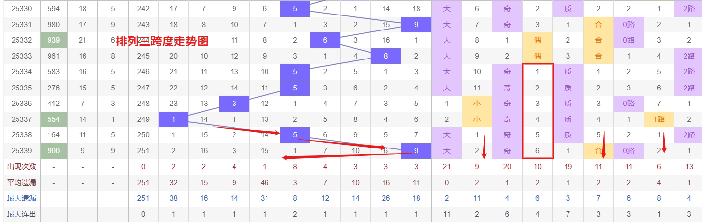 排列三 跨度分析:从上图可以看出近100期的跨度大小比约为48比52,跨度奇偶比约为45比55总体来看还是比较均衡的,但跨度大小之间有点差异。我们再从历史开出9跨后下一期6跨度数据来做参考。最近10期跨度大小比约为4:6期开出大数跨度过多返回小数跨度的概率更高一点。历史开奖近2期出9跨以后的走势为251期开出9跨后下一期走6跨走出3振幅,第283期开出9跨后下一期走7跨走2振幅第292期开出9跨后下一期开出5跨走出4个振幅。连续多期小振幅,近期排列三跨度走势分析,跨度4目前处于明显的冷态周期,遗漏值较大,根据冷热平衡的规律,其已具备较强的回补潜力和反弹需求,值得密切关注。与此同时,跨度6正处于热出阶段,短期内热度可能延续,需重点防范其再次开出。在追踪冷跨4回补机会的同时,对热跨6的持续表现保持警惕,本期预计跨度遵从历史会走出小振幅,出9跨度后容易走出1到4个跨度振幅的对称形态,跨度走出1到4个振幅看好的跨度有3467跨,所以第2025340期排列三跨度推荐3467跨。