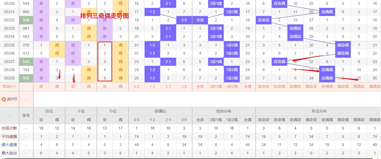 排列三 奇偶分析:从上图可以看出排列三100期内百位奇偶比约为54比46,十位奇偶比为50比50,个位奇偶比为49比51,十位的比值比较均衡,但是百位的比值偏差就有点大,历史奇偶形态近2期开出奇偶偶后下一期的走势为,第263期开出奇偶偶后264期开偶偶奇, 第287期开出奇偶偶后第288期开偶奇奇,第291期开出奇偶偶后第292期开偶偶偶,近期排列三奇偶形态走势来看,偶偶奇表现极为活跃,呈现出强劲的热态趋势,其热度惯性明显,短期内存在持续连下的可能性,与此同时,偶奇奇目前已遗漏长达34期,已进入深度冷态区间,根据冷热转换的周期性规律,该组合回补的迫切性与潜在风险正在急剧攀升,严加防范。在顺势追踪热态偶偶奇的同时,对冷态偶奇奇设置防守,所以排列三2025340期奇偶形态推偶偶奇与偶奇奇。