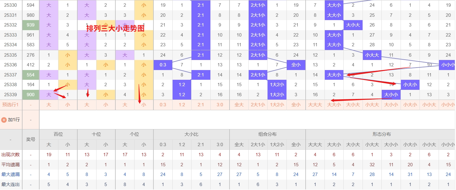 排列三 大小形态分析:从大小走势图上可以看出排列三100期内百位大小比约为47比53,十位大小比约为45:55,个位大小比约为52比48,除了个位奇数比偶数多,十位和百位是偶数比奇数多。历史数据近2期开出大小小下一期的走势为,第253期开出大小小第254期开小大大。第287期开出大小小后第288期开大大大,第296期开出大小小后297期开小小大。近期排列三大小形态走势分析,形态大大大正处在热出周期,短期内热度有望延续,需重点防范其继续开出。与此同时,形态小大大已平均遗漏多期,属于典型的冷号形态,根据冷热转换的规律,其反弹回补的可能性正在逐渐增加,值得密切关注。采取冷热兼顾的策略,在提防热号大大大持续的同时,也对冷号小大大的回补做好防守准备。所以排列三第2025340期大小形态推荐小大大防大大大。