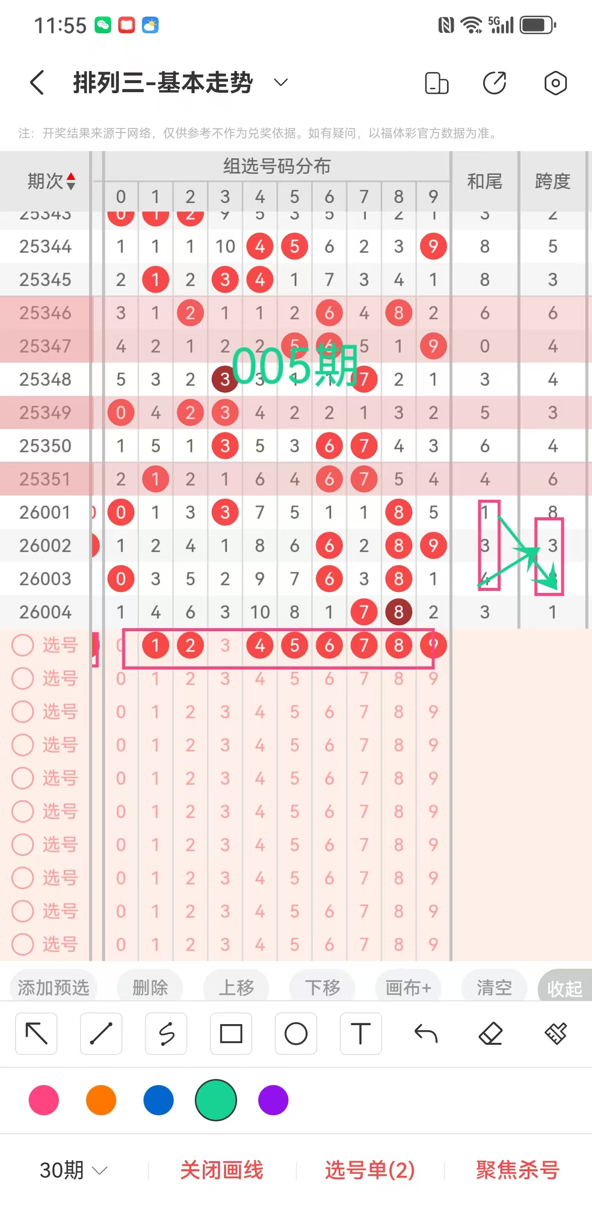 二、体彩排列三2026第005期组选分布,和尾,跨度分析,(五行八卦数字推演法)如下图:
