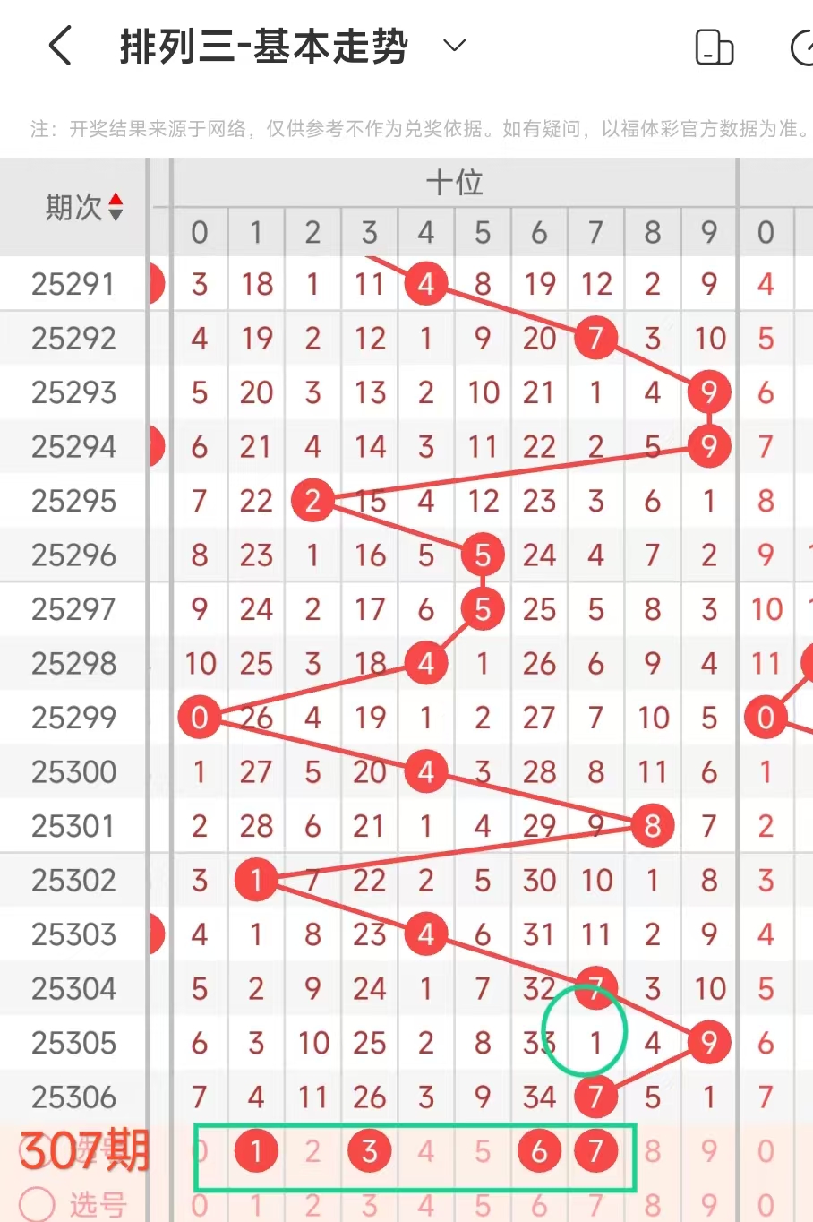经统计0号出现4次、1号出现3次、2号出现7次、3号出现6次、4号出现3次、5号出5次、6号出现10次、7号出4次、8号出现8次、9号出现9次.统计后出现次数靠前的数字作为我们的备选号码.其号码有23689等