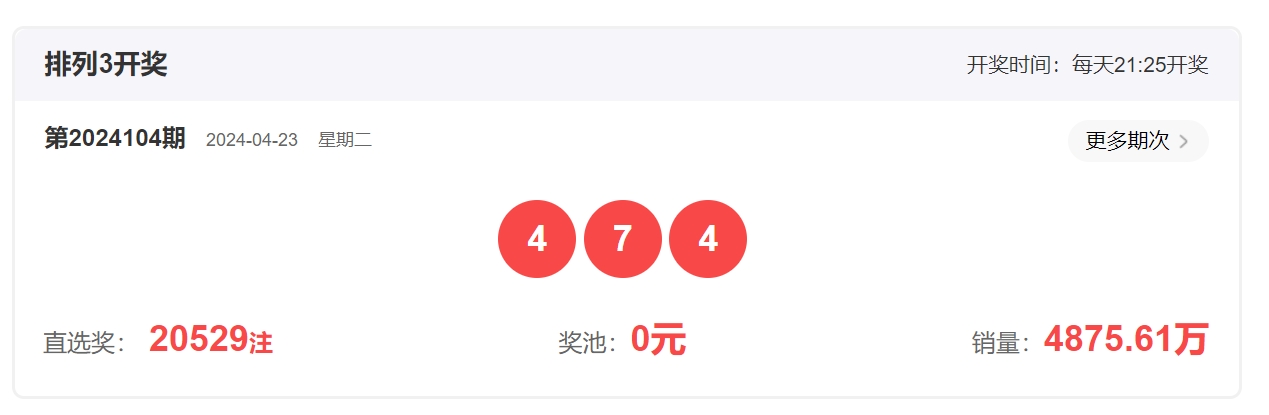 体彩排列3第20240104开奖号码为474,形态为组三,奇偶比1:2,和值15,跨度3,大小比1:2,【012】路个数比0:3:0。