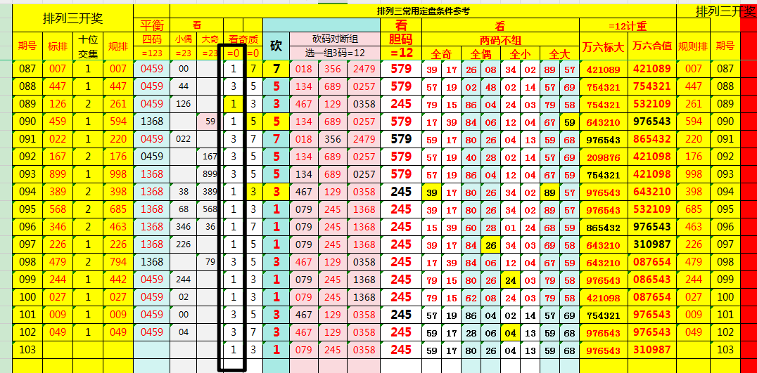 在选号过程中,缩水条件,不可或缺。组号缩水时,视轻而定,随机应变。本期条件参数如下: