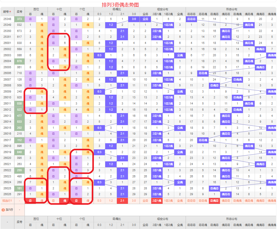 上一期的奇偶比为2:1,两奇的号码组合,从近五期的奇偶数出现情况看,奇数出8次,偶数出现7次,奇数偶数号码出现较平均,本期要侧重两奇的号码组合,侧重奇偶奇或奇奇偶的号码组合,根据奇偶组合形态可做五码定位02468/13579/02468或13579/13579/02468