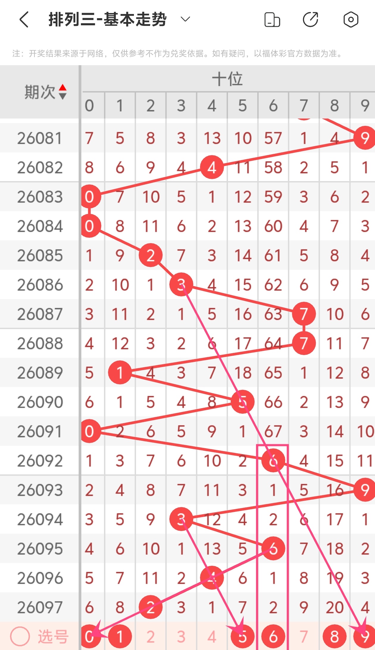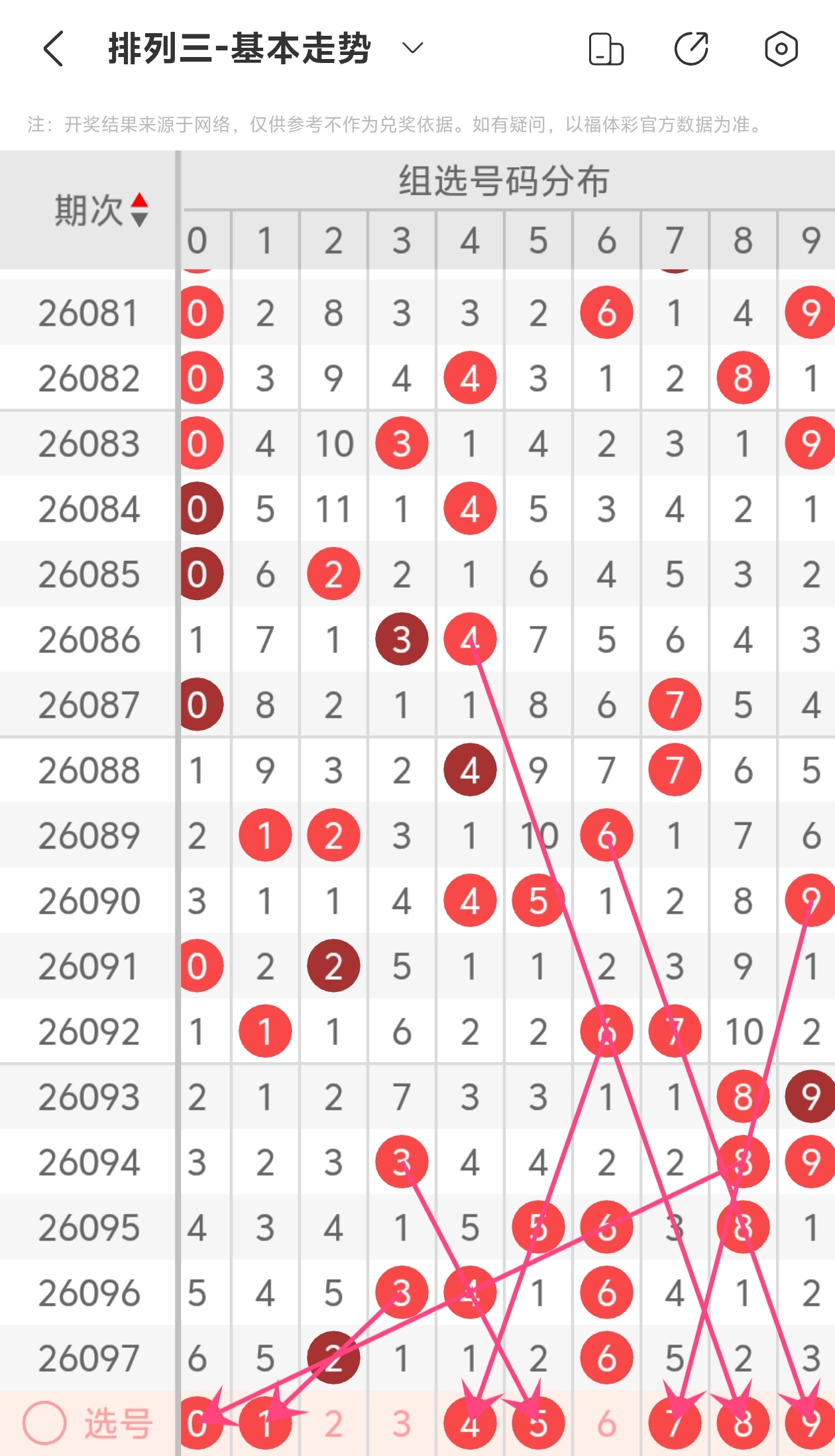通过以上简单分析,我们看下26098期号码的定位分析: