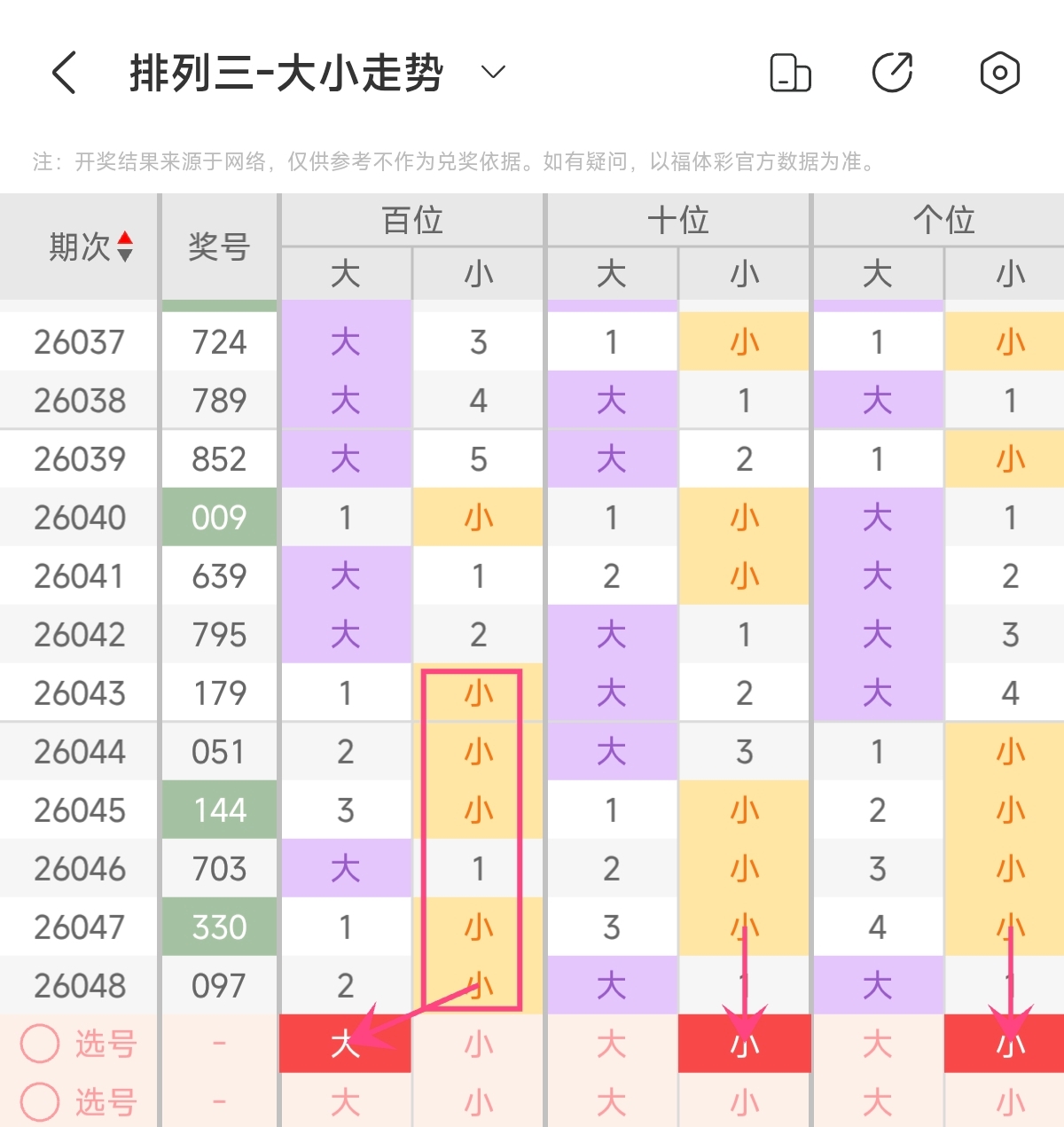 首先让我们回顾一下上期排列三第2026048期开奖号码为097,为组六形态,大小比为2:1,奇偶比为2:1,跨度为9,和值为16。