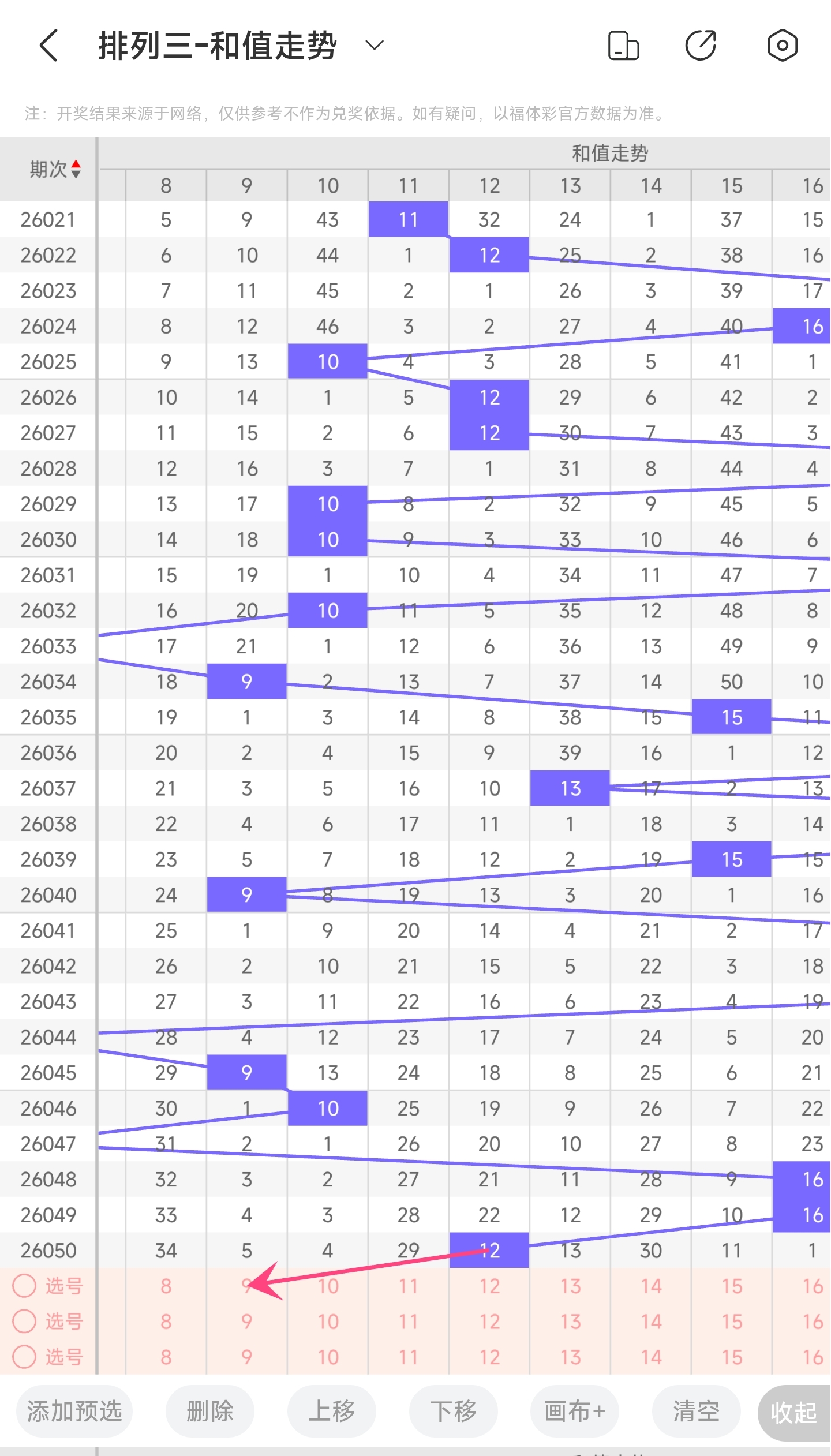 上期和值为12,往前一期和值为16,趋势往左移动,偏移量为4。通过走势图分析,12和值是近30期内开出比较小的和值,下降空间比较小,上升空间比较大,但本期比较看好和值变小。因此推测本期趋势是往左的,和值会变小,小概率往右,和值变大。