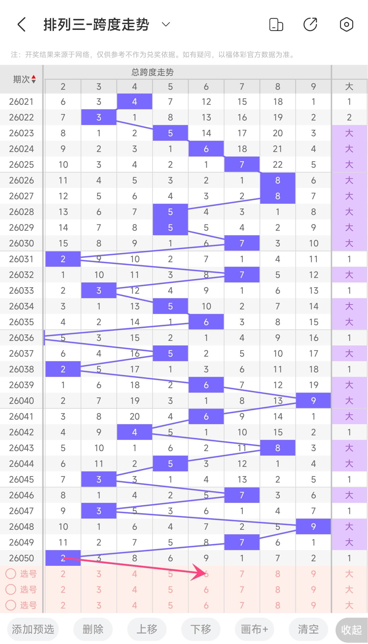 上期跨度为2,往前一期跨度是7,趋势往左移动,偏移量为5。跨度值2时,跨度值是近30期开出比较小的值。通过走势图分析,目前的趋势是大概率往右,小概率往左。所以推测本期跨度可能为45678等跨度。