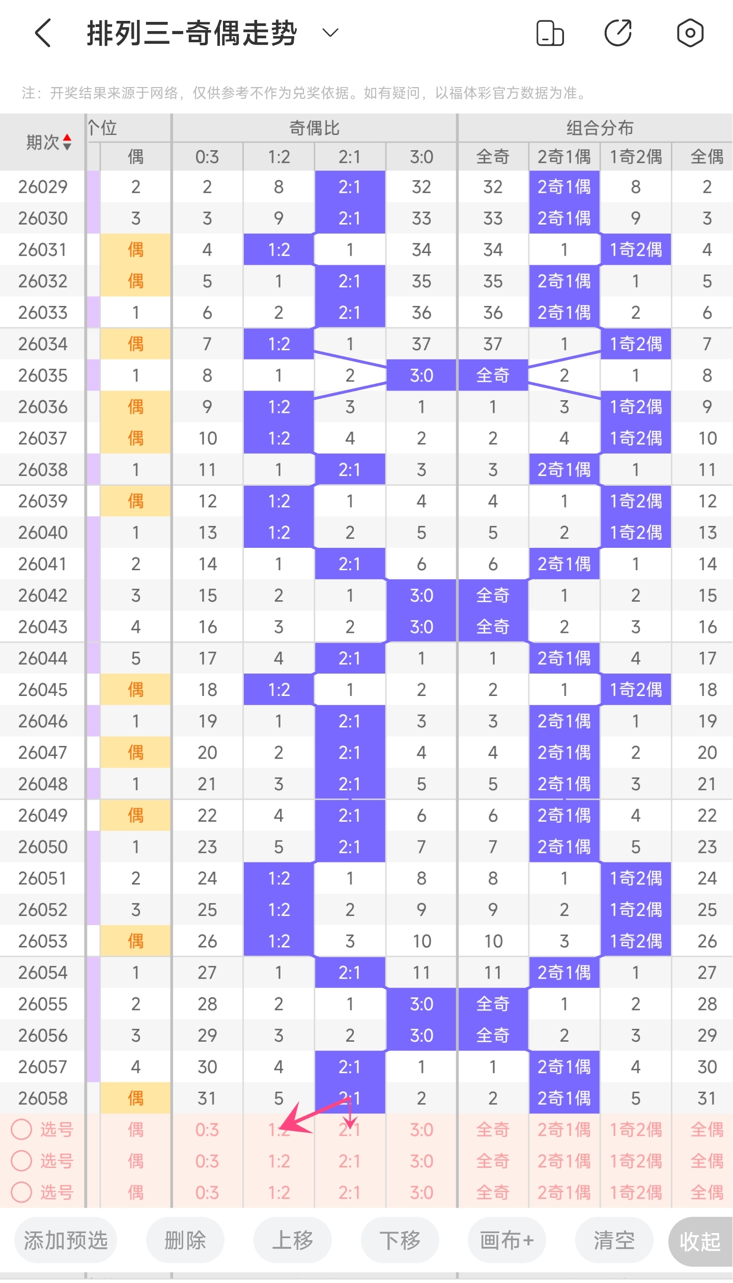 上期开出了2:1的奇偶比。往前一期是2:1奇偶比。通过分析奇偶走势图,近30期内开出1:2奇偶比的次数是10次,开出2:1奇偶比的次数是15次,3:0是5次,0:3是0次。和前一期相比,次数没有变化。通过走势图分析,上期开2:1奇偶比,本期看好1:2奇偶比。所以推测本期可能开1:2奇偶比,其次是2:1奇偶比,最后是3:0或者0:3奇偶比。