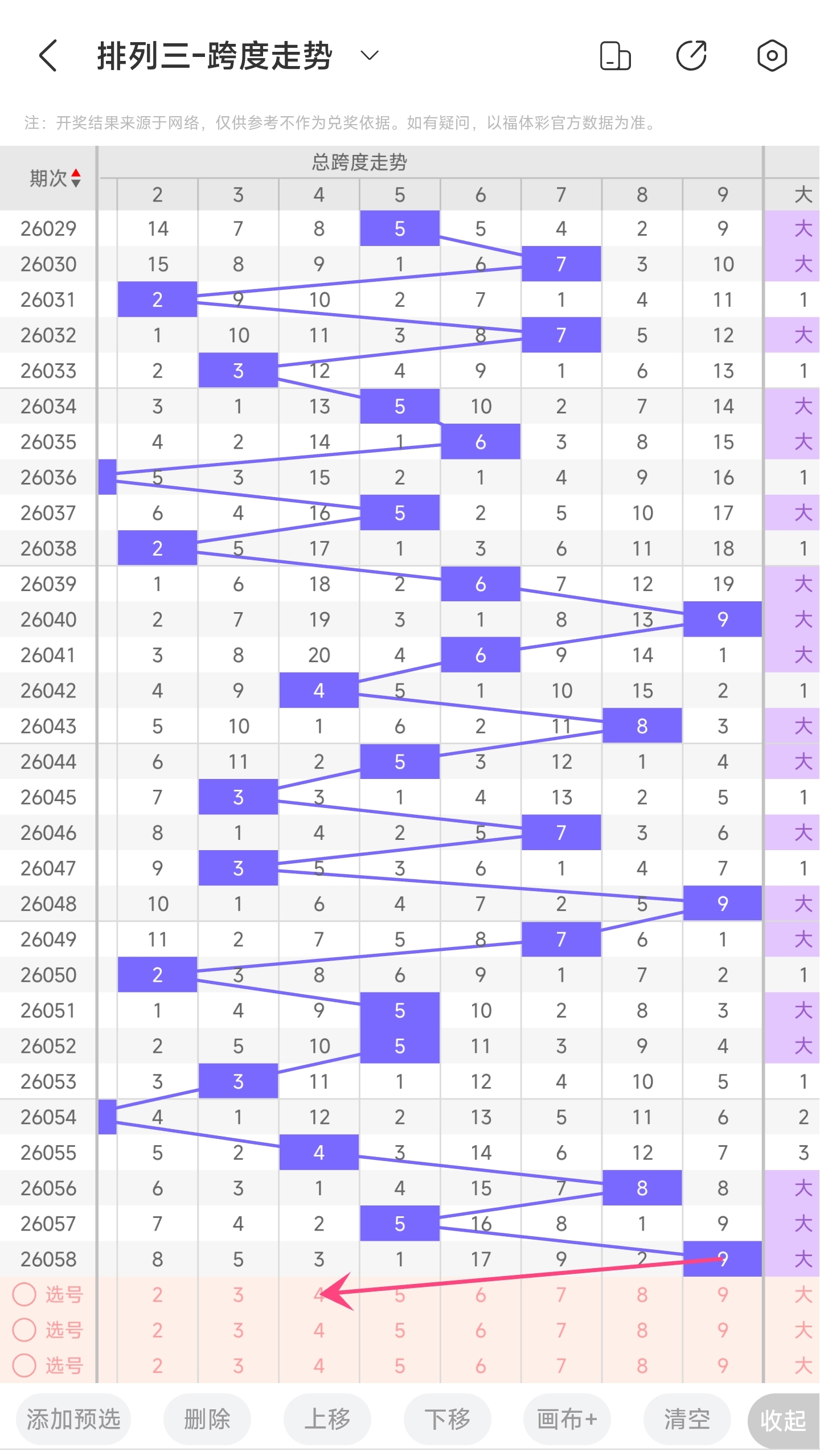 上期跨度为9,往前一期跨度是5,趋势往右移动,偏移量为4。跨度值9时,跨度值是近30期开出很大的值。通过走势图分析,目前的趋势是明显往左的了。所以推测本期跨度可能为34578等跨度。