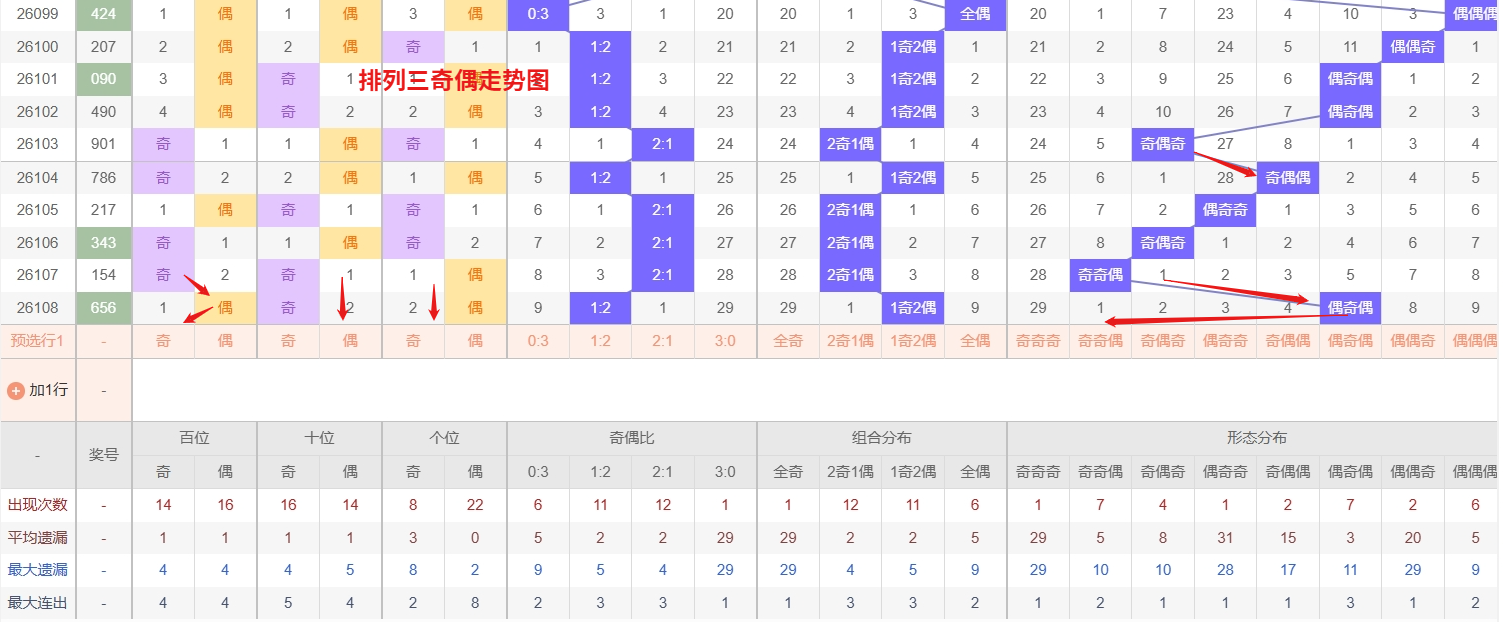 排列三 奇偶分析:从上图可以看出排列三100期内百位奇偶比约为46比54,十位奇偶比为51比49,个位奇偶比为53比47,十位的比值比较均衡,但是百位的比值偏差就有点大,历史奇偶形态近2期开出偶奇偶后下一期的走势为,第014期开出偶奇偶后015期开奇奇奇, 第027期开出偶奇偶后第028期开奇偶偶,第038期开出偶奇偶后第039期开偶偶奇,排列三奇偶走势中,近期奇奇奇和奇偶偶这两种形态均已进入冷态区间,从历史出号规律来看,两者都存在较强的回补可能。其中,奇奇奇作为全奇组合,在连续多期未现身后,其遗漏值已接近甚至超过常态回补周期,所以排列三2026109期奇偶形态推奇奇奇与奇偶偶。本文由一起彩钱是生命动力所著,请勿转载