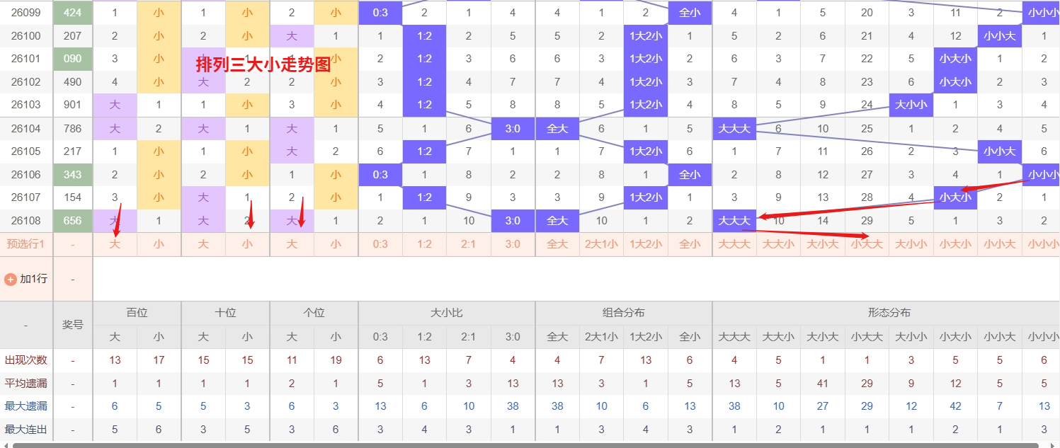 排列三 大小形态分析:从大小走势图上可以看出排列三100期内百位大小比约为52比48,十位大小比约为49:51,个位大小比约为53比47,除了个位和百位奇数比偶数多,十位偶数比奇数多。历史数据近2期开出大大大下一期的走势为,第005期开大大大后第006期开大小大。第014期开出大大大后第015期开小小大,第037期开出大大大后038期开小大大。近期排列三大小走势中,大小大与小大大这两种形态已形成明显的冷号格局,其间隔周期显著超出平均回补范围,从历史出号规律及冷热交替原理来看,长时间未出现的形态往往面临概率回归的压力,尤其当其他大小组合动时,这两个冷态组合的遗漏值已积累至临界区域,近期存在较强的回补预期,所以排列三第2026109期大小形态推荐大小大防小大大。本文由一起彩钱是生命动力所著,请勿转载