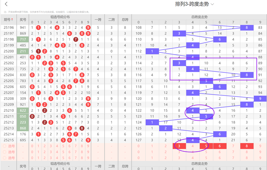 通过观察跨度及跨度属性走势可以发现:近10期内跨度01等号码较少出号,本期跨度大概率仍然不会开出01等号码,因此本期跨度选号时可以优先排除01等号码,再结合上述走势图看,本期跨度看好3568等号码。