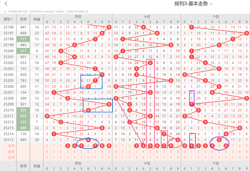 上一期百位开出号码为6,为偶数、大数、合数、0路号码:近10期百位开出大数号码后,下期容易连开大数号码,上期百位开出了大数号码6,本期百位大概率仍会开出大数号码,因此本期百位选号时应该考虑大数号码继续出号,结合上述走势图看,本期百位看好345789等号码。