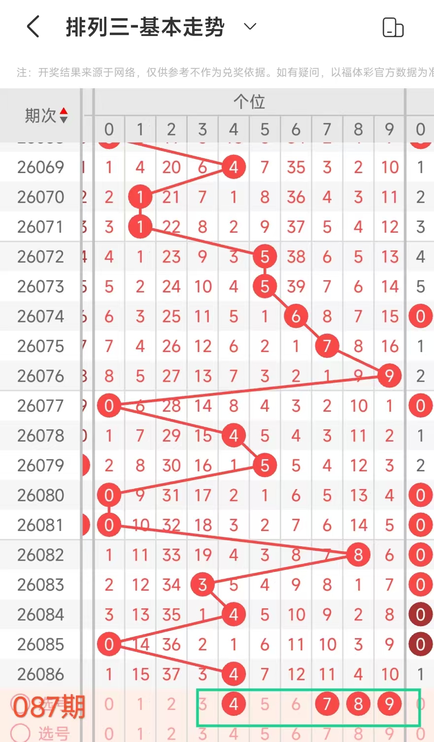 近10期开奖遗漏值分别 8 8 5 2 0 14 19 5 3 1奇偶属性分别为:偶偶奇偶偶偶奇奇奇奇,奇后可能出偶,而偶数遗漏值的有4789,本期不妨考虑一下。