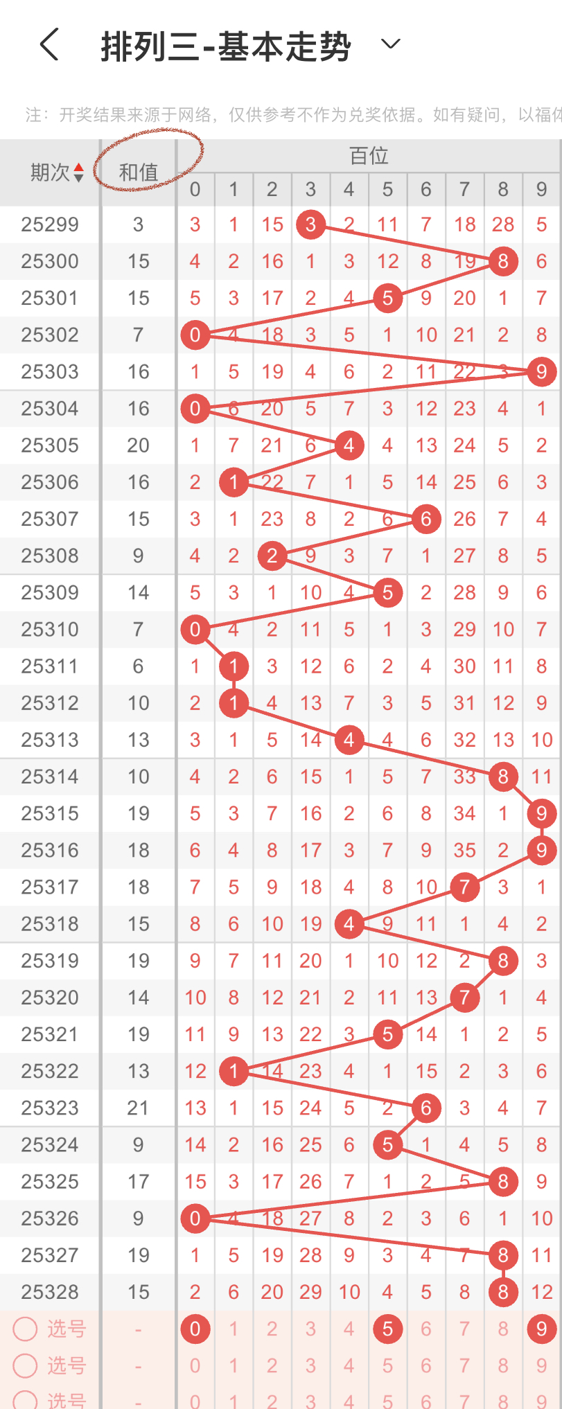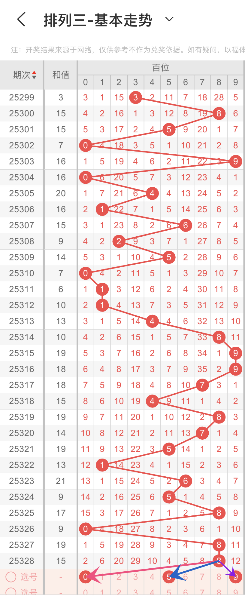 结合上面的大小、奇偶以及012路比,我们可以得到的数据分别是第一组56789,第二组13579,第三组0369,我们重点选择3组数据中重复的,那百位我们选择9,防0路的0,2路的5,综上所述百位选059