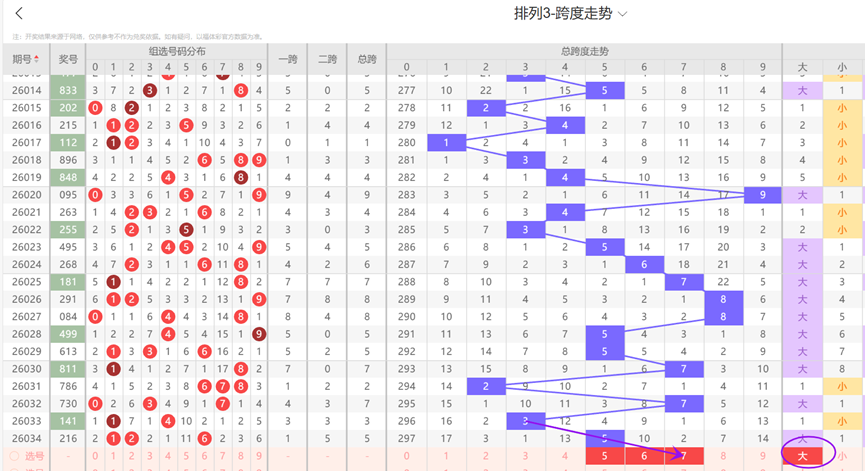通过观察跨度及跨度属性走势可以发现:近10期内跨度开出大数号码后,下期容易连开大数号码,因此本期跨度选号时应该继续考虑大数号码,再结合上述走势图看,本期跨度看好567等号码。