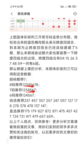 上图是上期体彩排列三号码分析文章截图,我最后推荐的8码,7码正确,这个你们去看上期的号码分析文章吧。