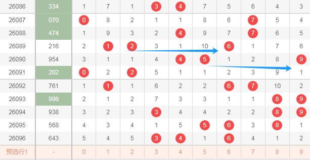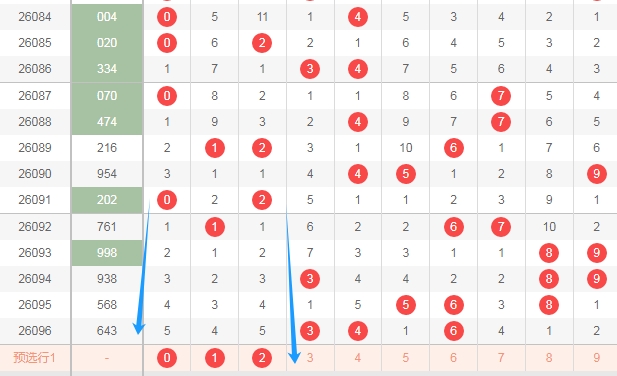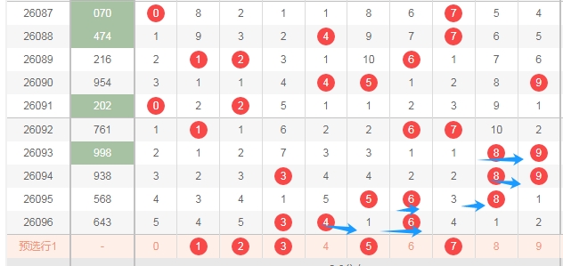 上图是体彩排列三开奖号码走势分布图,我标注出来的蓝色箭头表示合数数字,上期又开出了两个合数数字一个质数数字,最近几期开出的合数多,那么本期质数数字12357可以关注出一个或者两个,防出3个吧。