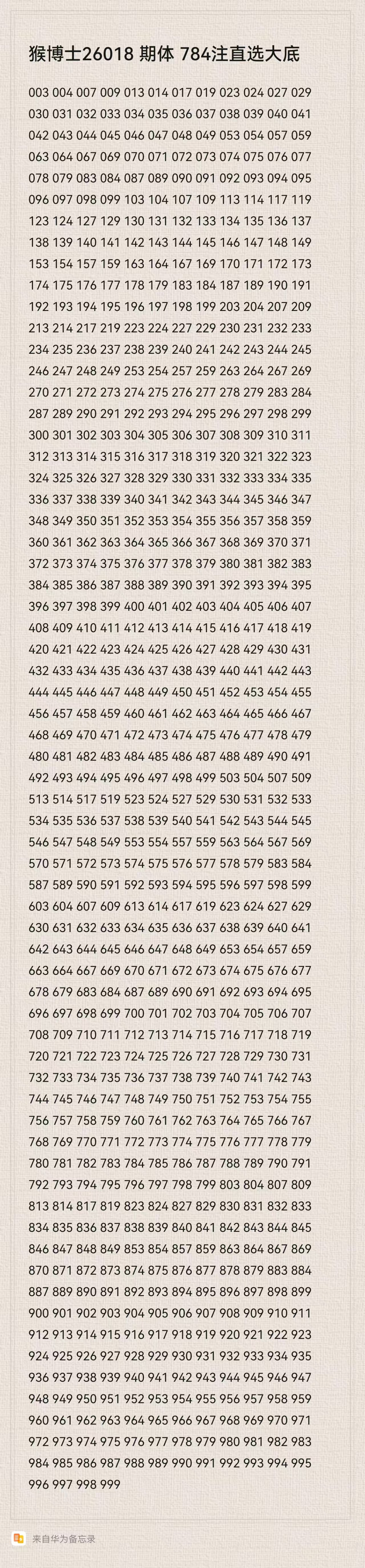 猴博士26018期排列三784注直选大底:(可以当母底用,然后进行缩水)