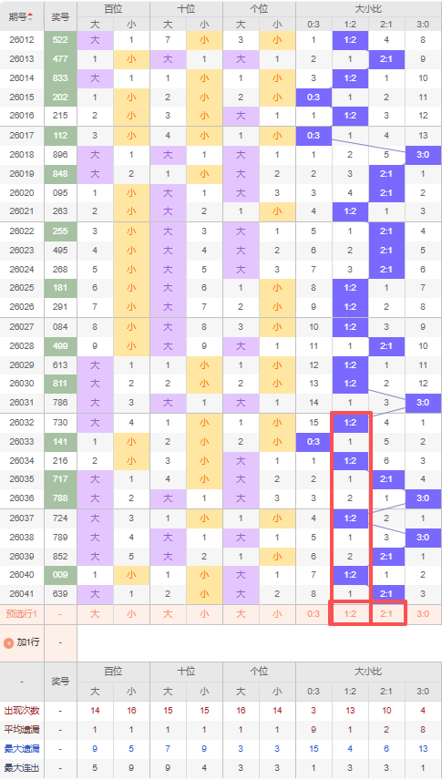 上期大小比:2:1,近10期大小比出现情况:1:2、0:3、1:2、2:1、3:0、1:2、3:0、2:1、1:2、2:1,最近10期出3期2:1,出现4期1:2,出现1期0:3,出现2期3:0,根据近10期出号规律本期推荐连出2:1,防隔期出1:2,综上所述大小比推荐:防:1:2,重点关注:2:1。