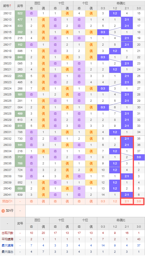 上期奇偶比:2:1,近10期奇偶比出现情况:2:1、2:1、1:2、3:0、1:2、1:2、2:1、1:2、1:2、2:1,最近10期出现4期2:1,出现5期1:2,出现0期0:3,出现1期3:0,根据近10期出号规律本期推荐连出2:1,防遗漏6期出3:0,综上所述奇偶比推荐:防:3:0,重点关注:2:1。