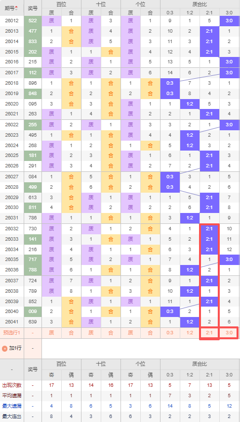 上期质合比:1:2,近10期质合比出现情况:2:1、2:1、2:1、3:0、1:2、2:1、1:2、2:1、0:3、1:2,最近10期出现5期2:1,出现3期1:2,出现1期0:3,出现1期3:0,根据近10期规律本期推荐遗漏2期出2:1,防遗漏6期出3:0,综上所述质合比推荐:防:3:0,重点关注:2:1。