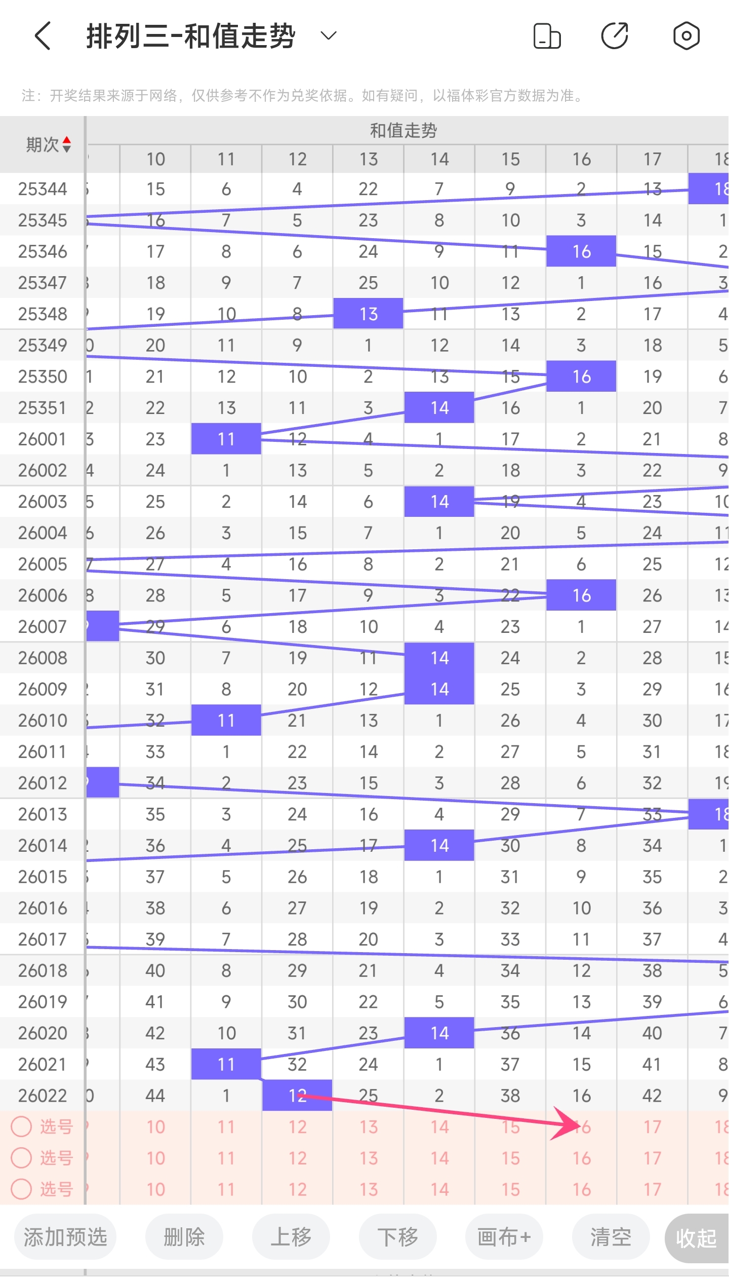 上期和值为12,往前一期和值为11,趋势往右移动,偏移量为1。通过走势图分析,12和值是近30期内开出比较小的和值,下降空间比较小,上升空间比较大。本期看好和值变大,因此推测本期趋势是往右的,和值会变大,小概率往左,和值变小。