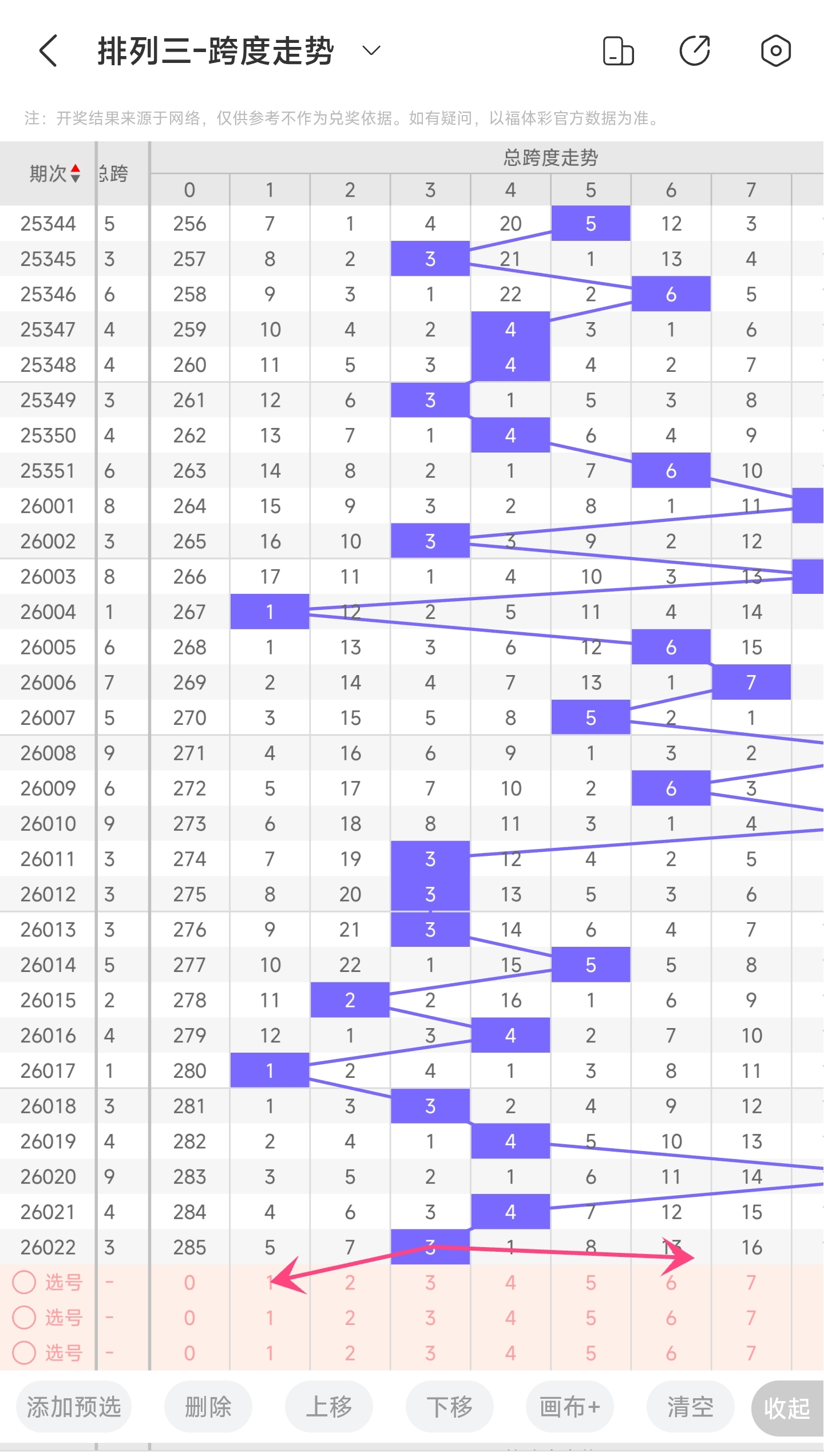上期跨度为3,往前一期跨度是4,趋势往左移动,偏移量为1。跨度值3时,跨度值是近30期开出比较小的值。通过走势图分析,目前的趋势是大概率往右,小概率往左。所以推测本期跨度可能为24567等跨度。