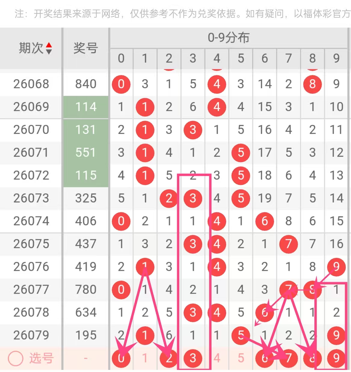 胆码3:和尾关联。近5期和值分别为15(7+8+0)、14(4+1+9)、14(4+3+7)、10(4+0+6)、10(3+2+5)。和尾依次为5、4、4、0、0。下期和尾常见跟随为3或6,而和尾3对应的最小和值13中,数字3是构成关键。同时3在近5期仅出现1次(2026075期),具备出号空间。