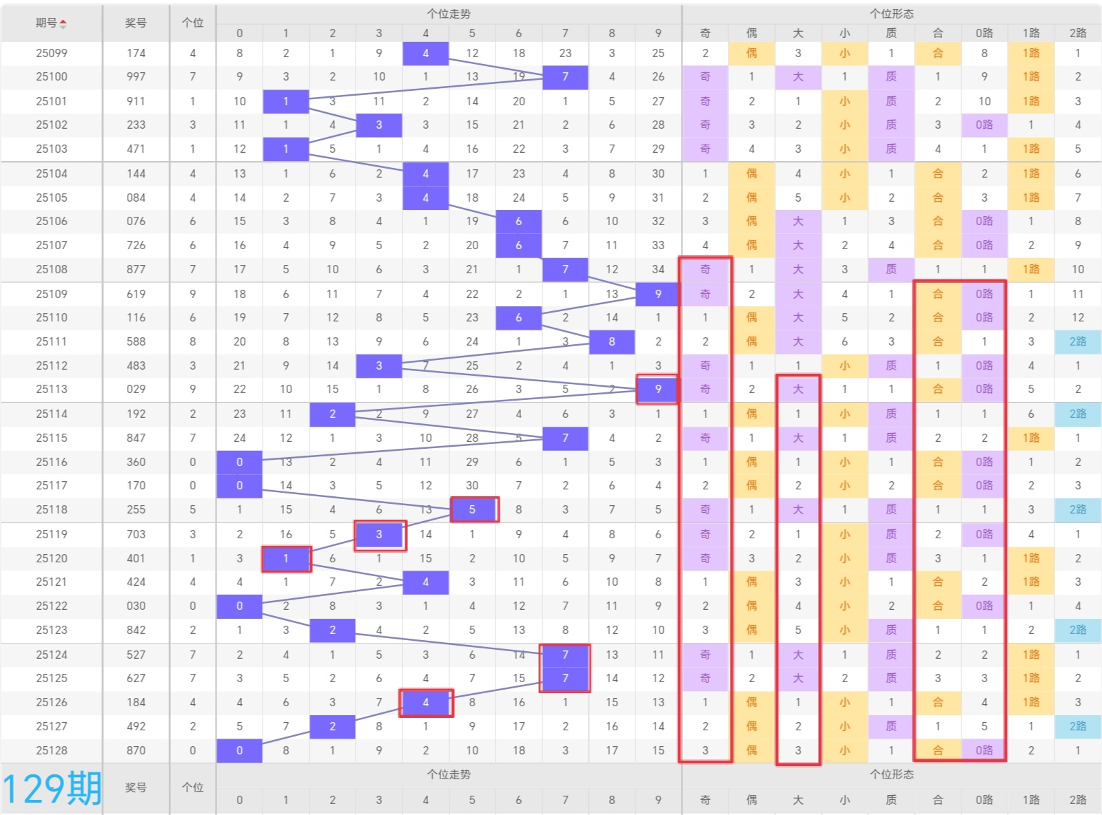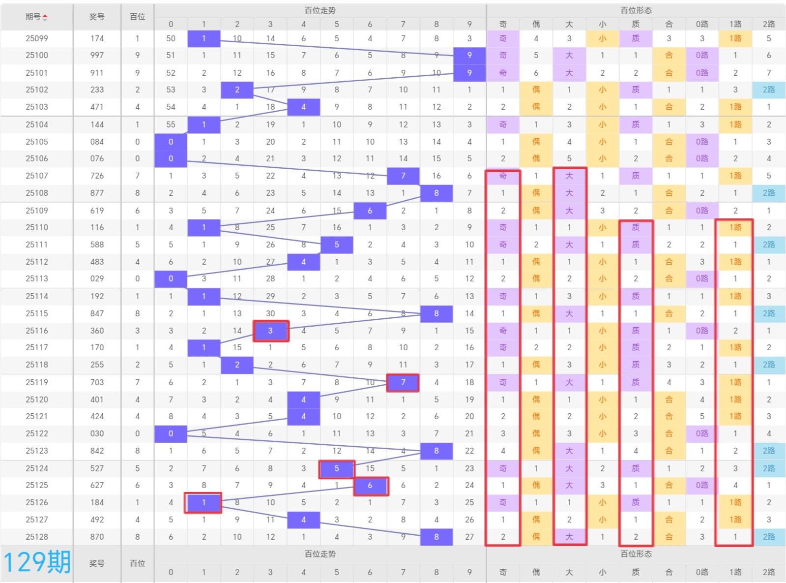 百位:上期在后半段7~9开出号码,7可能与8形成斜连走势,本期可能会在中间段3~6和后半段7~9开出号码,百位连续两期开出偶数,本期可能开出奇数,可能是大数和质数,百位上期开出2路号码,本期可能开出1路号码,防守0路号码。
