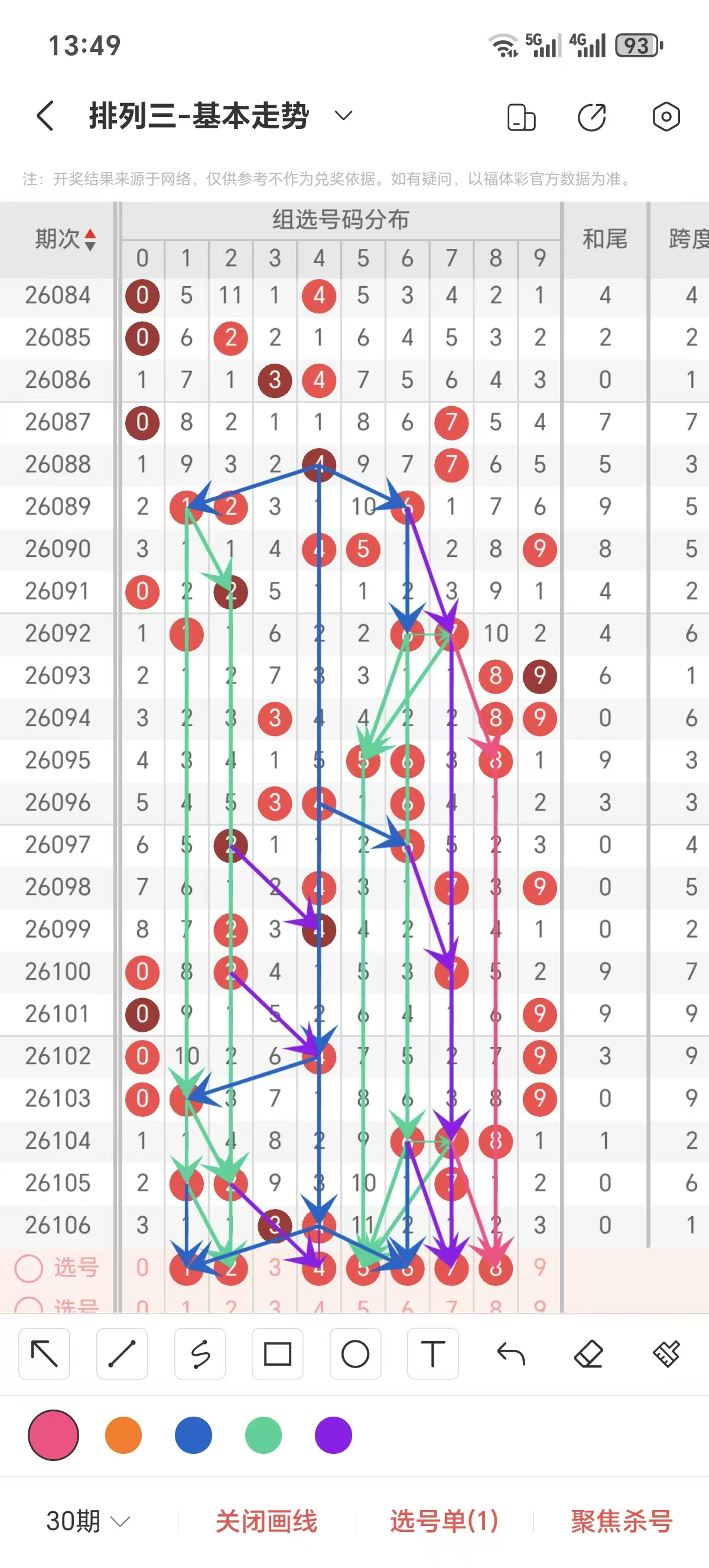 通常情况下在五期之内重复一个跨度的概率较高,近五期重复了9的跨度,近五期跨度为9/9/2/6/1,近期0路的跨度较热,本期要侧重3/5/6跨为主的号码组合。选择好跨度就可以从跨度方面选择相应的双胆码组合,双胆码的选取要根据近期和历史的走势进一步的分析选取。