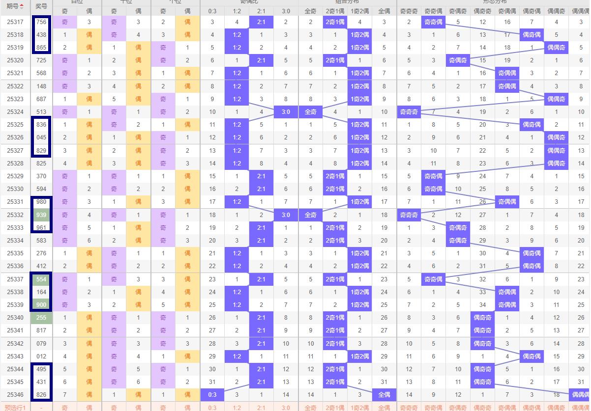 奇偶比例分析 奇偶比例同样是排列3分析中的重要一环。346期开奖号码为826奇偶比为0:3;从近期走势图来看,奇偶比例分布较为均衡,没有出现明显的偏态。因此,本期可以继续关注1:2或者2:1的奇偶比例。可以根据这一比例进行号码筛选。