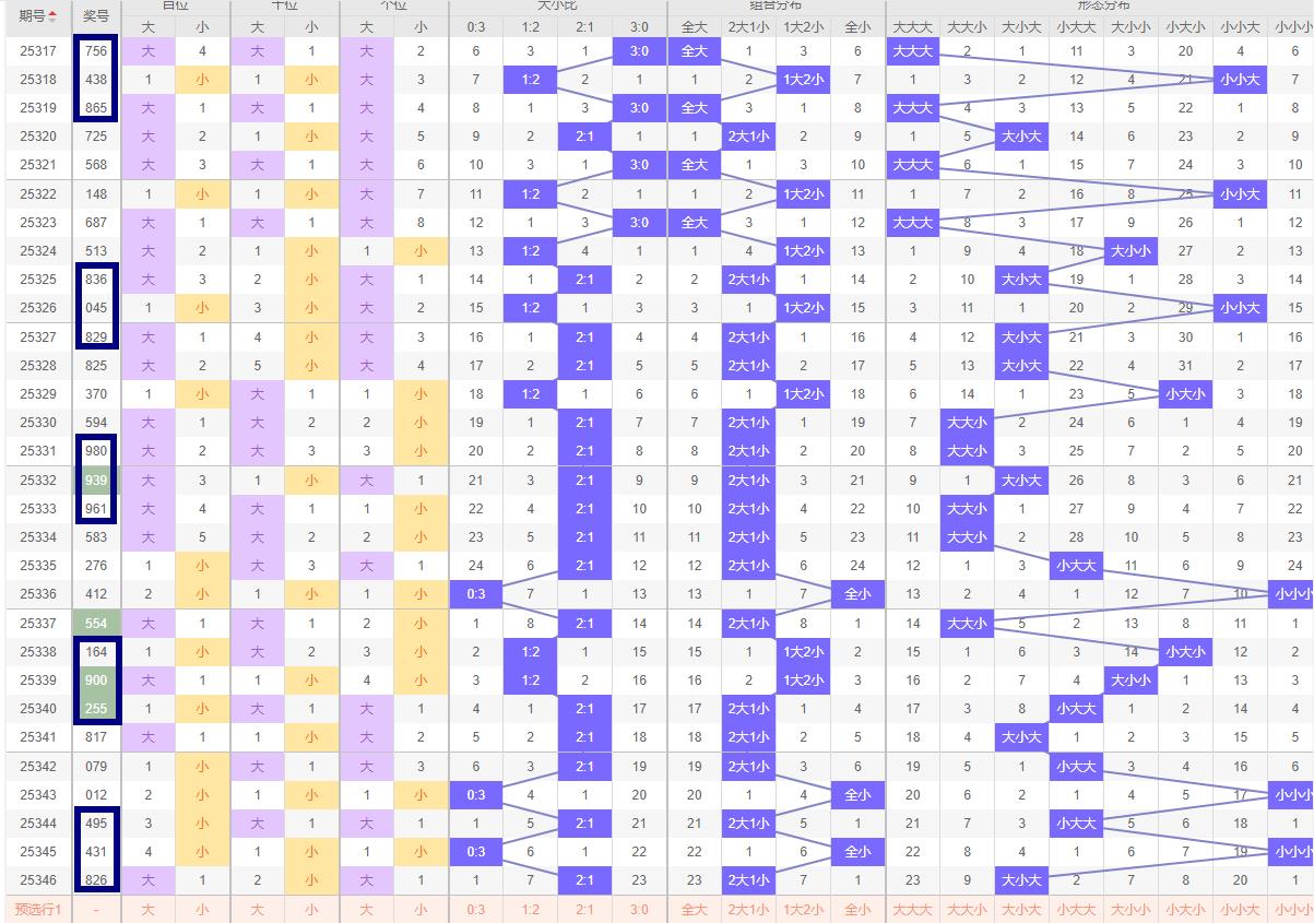 大小走向分析: 在排列3中,大小走势是判断号码分布的重要依据。根据346期开奖结果826,大小比为2:1;形态偶偶偶。结合历史走势图,发现近10期大小比例为14:16,小数保持优势;因此,347期关注的大小比例1:2,可能会出现一个大奖号和两个小奖号,应充分考虑这一趋势,合理分配投注比例。