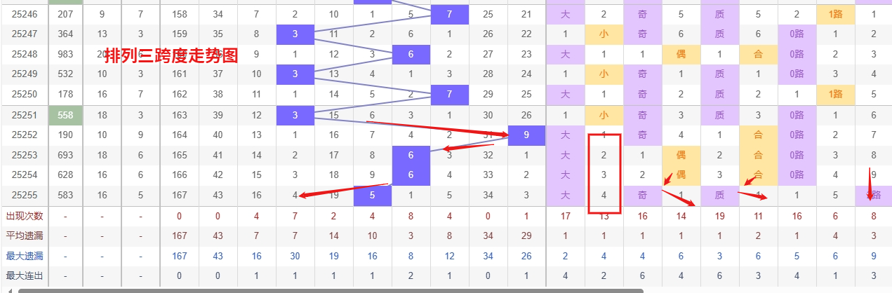 排列三走势分析:从上图可以看出百位号码连线走势到大奇数5 ,近10期内大数小数之间基本均衡,近期大数空缺较多有走向大数的势头。上期开出奖号5,回补了大奇数2路号码的不足符合我们的预期。前10次百位开出奖号5之后,其下期分别开出码:879239515,其中号码奇偶比约为5:5,大小比约为6:4,从近期排列三百位走势分析,数字4和8已持续多期未见开出,形成了显著的冷态,尤其两者同时遗漏,根据号码分布的平衡法则,冷号不会永远沉默,其回补的动能正随着遗漏值的扩大而持续增强,尤其需要关注当百位走势结束当前热点区域后,向冷号区间进行轮动的可能性。然而,在紧盯冷号反弹的同时,对热号1的防范绝不可松懈,该号码在百位近期表现异常活跃,呈现出强者恒强的热态特征,在冷号未成功回补之前,热号仍有极大概率凭借其惯性再次开出。因此,综合采取“围冷防热”的策略,将捕捉冷号4和8的回补作为主要方向,但必须为热号1的持续强势预留足够的防守空间,本期该位注意号码:34178,排列三十位走势上近期小数一直占据上风比较强势且出号热区一直处于小数,回补了一期小数后有返回大数的可能,第2025255期开出大偶数8。从近期排列三十位走势分析,数字0、3、4已集体进入冷态周期,尤其是0路和中间区域的号码出现明显断档,这种多码同时遗漏的现象往往预示着十位格局正积蓄着较强的变盘动能;根据概率均衡原则,冷号群体性回补的需求正不断上升,一旦走势脱离当前热点,这些冷号极有可能呈现轮动或集中反弹的态势。然而,在重点关注冷号回补的同时,对热号9的防范必须保持高度警惕,该号码在十位近期表现异常强势,呈现出典型的热态延续特征,其强大的惯性在未出现明确转折信号前,仍是当前最需防范的对象。因此,采取“以冷为主、以热为辅”的复合策略,在密切追踪0、3、4等冷号反弹迹象的同时,对热号9的持续开出做好针对性防守,所以第2025256排列三十位看好03479,个位经过2期的偶数回补后走奇数的可能开出号码3符合我们的预期,本期有继续走奇数的迹象。连线走势上到小奇数3,0路号码奇数,从近期排列三个位走势观察,数字5、6和9已集体陷入冷态周期,尤其是中间区域及大号出现同步遗漏,这种现象表明个位的号码分布正积蓄着显著的变盘能量;根据概率均衡法则,冷号群体往往不会长期沉寂,其回补需求正随着遗漏周期的延长而不断累积,尤其需要警惕当走势出现小幅震荡或跨度收窄时,这些冷号可能呈现轮番反弹或集中爆发的态势。考虑到个位号码通常具有更强的随机性和周期性,所以排列三第2025256期个位推荐12569。