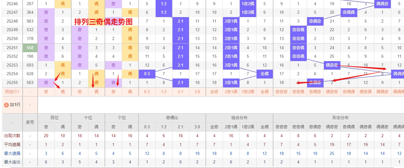排列三 奇偶分析:从上图可以看出排列三100期内百位奇偶比约为55比45,十位奇偶比为47比53,个位奇偶比为46比54,十位的比值比较均衡,但是百位的比值偏差就有点大,历史奇偶形态近2期开出奇偶奇后下一期的走势为,第174期开出奇偶奇后175期开奇奇偶, 第182期开出奇偶奇后第183期开奇奇奇,第195期开出奇偶奇后第194期开偶奇偶,从近期排列三奇偶走势来看,“奇奇偶”和“奇奇奇”组合呈现出明显的热态,连续开出的频率较高,形成了一种强势的奇号主导格局,尤其在百位和十位上奇数的稳定性非常突出。根据趋势惯性原则,在热态未出现明确转折信号前,必须重点防范这两种组合的持续开出。与之形成鲜明对比的是,“偶奇偶”组合已陷入深度冷态,遗漏期数较长,从概率均衡的角度看,任何组合都不会长期缺失,其回补的需求正随着遗漏值的扩大而不断增强。 所以排列三2025256期奇偶形态推奇奇偶与偶奇偶。