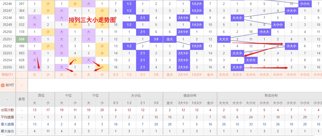排列三 大小形态分析:从大小走势图上可以看出排列三100期内百位大小比约为46比54,十位大小比约为49:51,个位大小比约为55比45,除了百位和十位奇数比偶数多,个位是偶数比奇数多。历史数据近2期开出大大小下一期的走势为,第161期开出大大小第162期开小小大。第177期开出大大小后第178期开小小小,第183期开出大大小后184期开大小大。从近期排列三大小走势分析,“小小大”和“大小大”组合已持续多期未见开出,双双进入明显的冷态周期,其遗漏值均攀升至较高位置;根据组合走势的平衡特性,冷态组合始终存在强烈的回补需求,尤其“大小大”这种结构相对均衡的形态,一旦反弹往往具备较强的爆发力,值得重点跟踪关注。然而,冷号组合的具体回补时机通常需要等待一个明确的格局转折信号,与此同时,“小小小”组合近期表现极为活跃,呈现出典型的热态特征,所以排列三第2025256期大小形态推荐小小大防小小小。