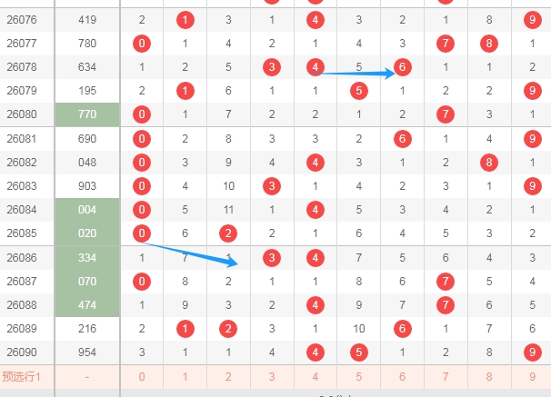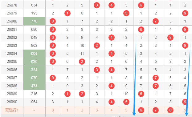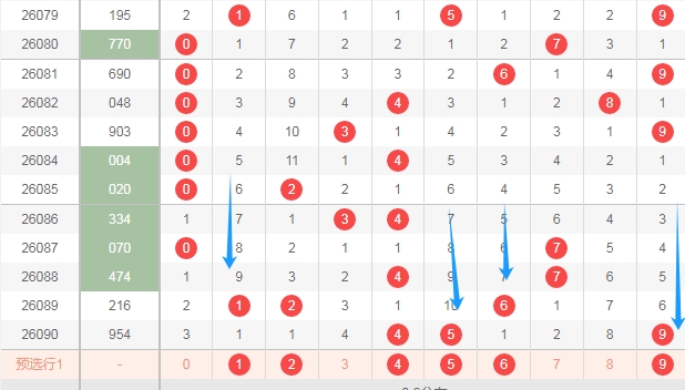 上图是体彩排列三开奖号码走势分布图,我标注出来的蓝色大箭头中间这个区域的数字678上期是一个数字没出现,最近几期这个区域出号码不多,那么本期这个区域的数字678可以关注出一个或者两个。